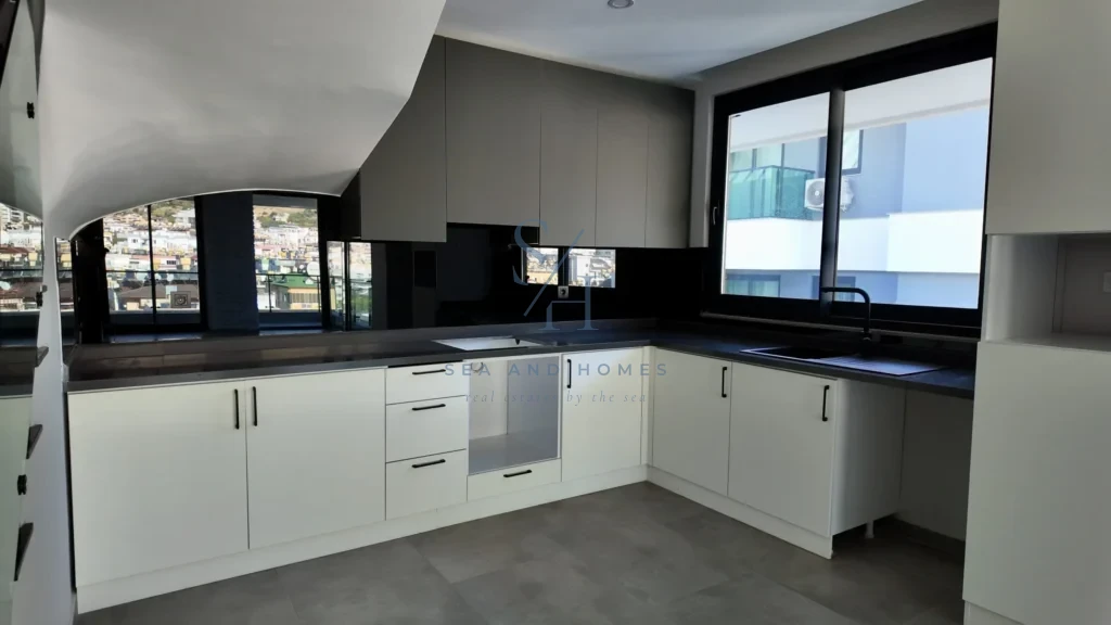 Ten dwupoziomowy apartament o powierzchni netto 77 m² (brutto ok. 90 m²) został zaprojektowany z myślą o najbardziej wymagających inwestorach. Układ 2+1 oferuje przestronny salon z aneksem kuchennym wykończonym marmurowymi blatami oraz dwie komfortowe sypialnie na wyższej kondygnacji. Dzięki południowej ekspozycji, wnętrza są zalane naturalnym światłem, a duże balkony stają się idealnym miejscem do podziwiania zachodów słońca nad Alanyą.